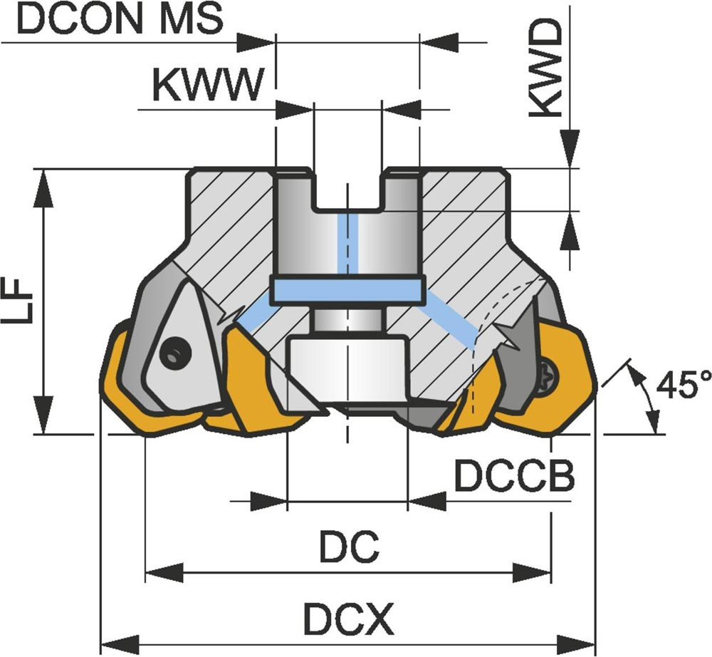 Planfräser mit doppelt negativer Geometrie zum spannen von 10 Stück HNGX 0906AN.. oder XNGX 0906AN.. doppelseitigen Wendeschneidplatten · Schnittdurchmesser 125 bis maximal 136.7mm mit 45° Anstellwinkel und 40mm Verbindungsbohrung gemäß DIN 8030-A · 63mm Überstandslänge · Kühlkanalbohrung und ungleiche Teilung zum Planfräsen · Rampen · progressiven Eintauchen und Entgratfräsen mit einer maximalen Schnitttiefe von 5.0mm