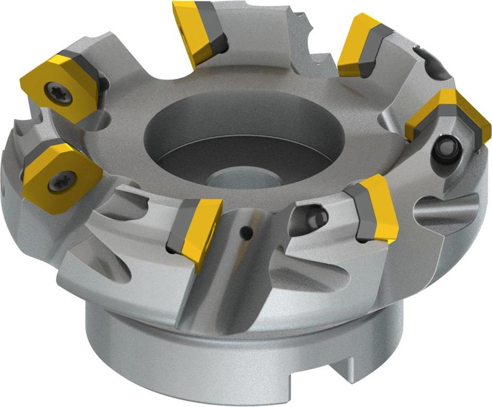 Planfräser mit positv/negativer Geometrie welche 7 aus SDET 13T3.. · SDMT 13T3.. oder XDET 13T3.. einseitige Wendeschneidplatte · Schneiddurchmesser 80mm bis maximal 93,4mm mit 45° Anfahrwinkel und 27mm Bohrung gemäß DIN 8030-A · 50mm funktional und · durchgehende Kühlung und ungleicher Teilung zum Planfräsen und Entgraten mit einer maximalen Schnitttiefe von 6,4mm