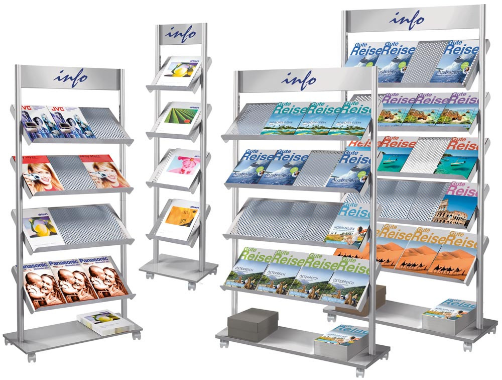 Prospektregal aus Stahl, 4 Stahlböden für 12 x DIN A4, BxTxH 785x300x1650 mm, fahrbar, alusilber E858068
