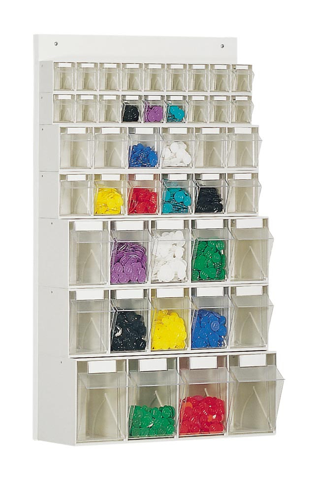 Regalwand, BxTxH 600x108x410 mm, 30 Kästen, 12xGr. 6, 18xGr. 9, Gehäusefarbe weiß