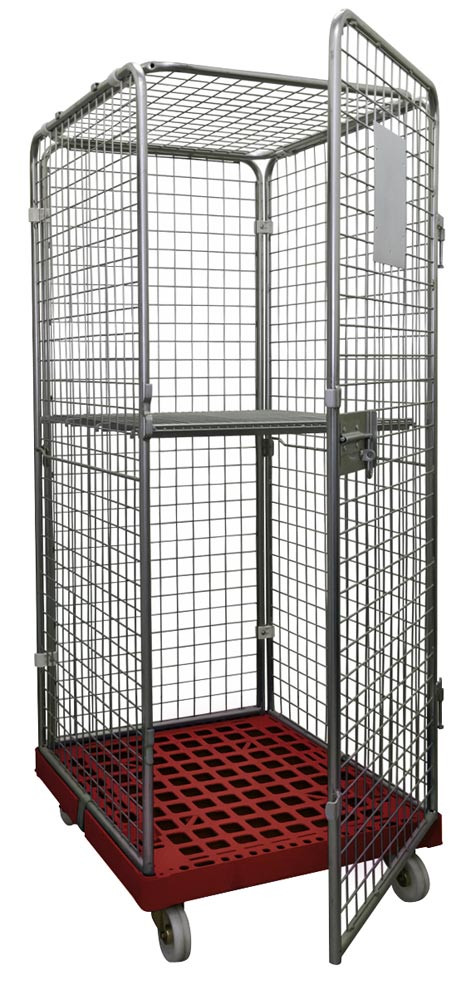 Rollbox mit Drahtgitterwänden, 5-seitig (1 Tür), 1 Boden, Nutzhöhe 1585 mm, LxBxH 810x720x1800 mm, Bodenplatte aus HDPE, RAL 3000 feuerrot E1979125