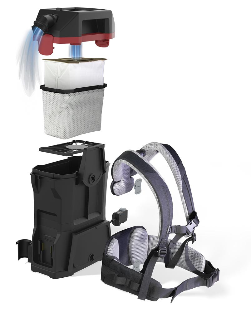 Kabelloser Rucksacksauger mit äußerst niedrigem Gerätegewicht von nur 4,4 kg ∙ Mit bürstenlosem 300 Watt EC-Motor ∙ Mit einer Laufzeit von bis zu 90 Minuten eignet sich das Gerät ideal für lange Arbeitseinsätze in beengten oder schwer zugänglichen Bereichen wie öffentlichen Verkehrsmitteln, Kino- und Theatersälen oder Treppenhäusern ∙ Dreifaches HEPA 13-Filtersystem sorgt für eine saubere Ausblasluft, geeignet für Gesundheitswesen und Kindergärten