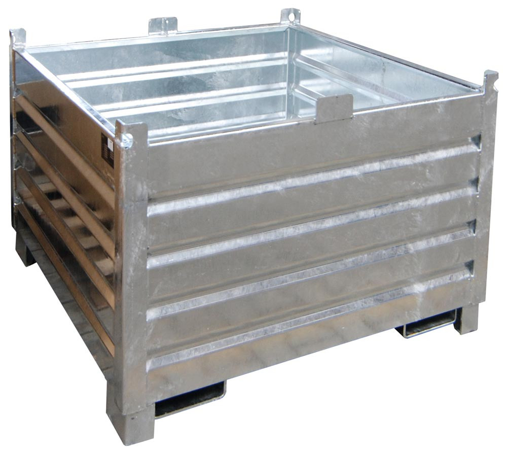 ∙ Stapelbare, robuste Transport- und Sammelbehälter aus Stahlblech ∙ Platzsparendes Aufbewahren und Bereitstellen Ihrer Lagergüter und Wertstoffe ∙ Aufnahmen für Gabelstapler und Kran ∙ Optimale Ausnutzung von LKW-Ladeflächen durch Rastereinheit von 600 mm, Höhe von 850 mm und Stapelbarkeit ∙ Einsetzbar im Innen- und Außenbereich