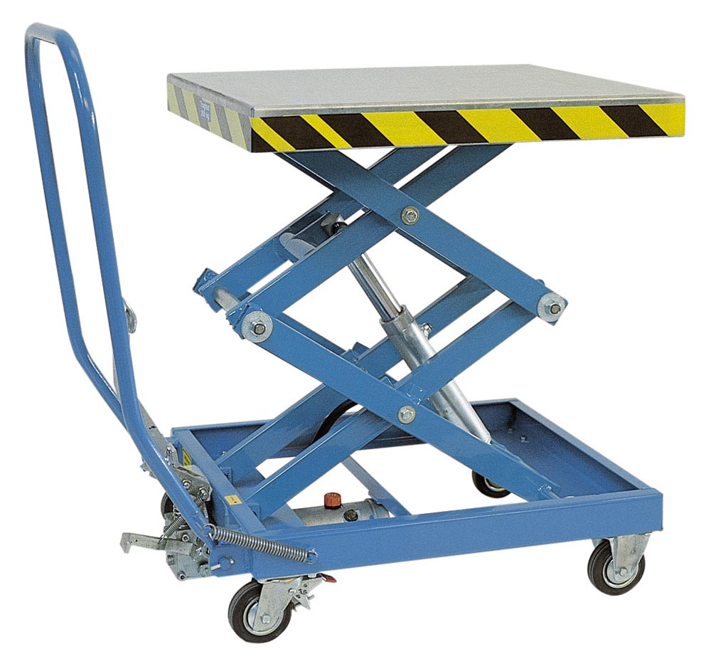 ∙ Entsprechend der europäschen Vorschriften DIN EN 1570 ∙ Schwere Ausführung für den robusten Einsatz ∙ 4 mm starke verzinkte Plattform auf Unterrahmen ∙ Mit klappbarer Deichsel ∙ Hub über Fußpumpe ∙ Große Räder ∙ Lenkräder serienmäßig mit Stoppvorrichtung