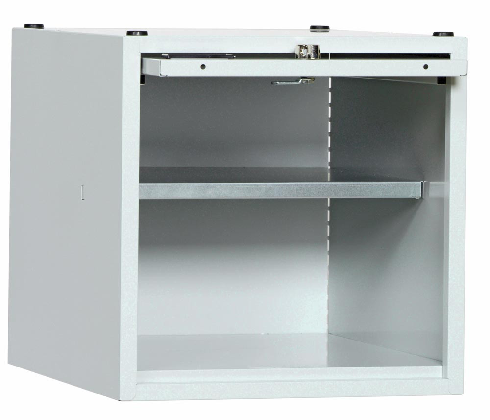 ∙ Glatte Einschubtür, mit Lochbild und Etikettenrahmen ∙ Mit Stapelecken und einem zurückgesetzten, herausnehmbaren Fachboden ∙ Drehriegelverschluss für Vorhängeschloss ∙ Gehäuse RAL 7035 lichtgrau