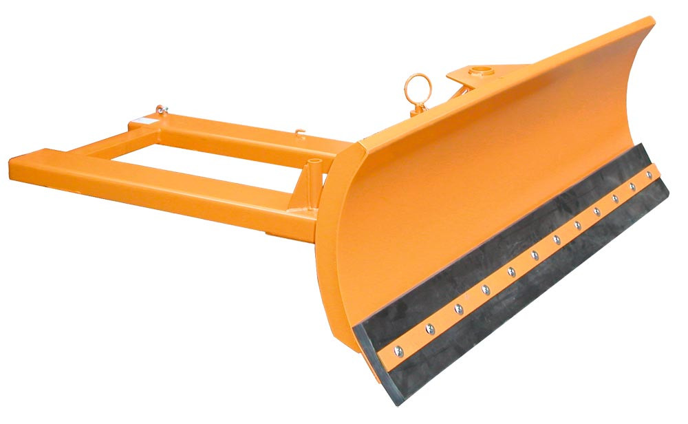 ∙ Robuste Stahlkonstruktion RAL 2000 gelborange lackiert · Gummischürfleiste ∙ Einfache Aufnahme mit Gabelzinken ∙ Sicherung gegen unbeabsichtigtes Abrutschen ∙ Räumschild 2-fach nach rechts und links verstellbar ∙ Schnelles Wechseln der Schürfleisten und Federklappschare möglich · Schildhöhe 620 mm