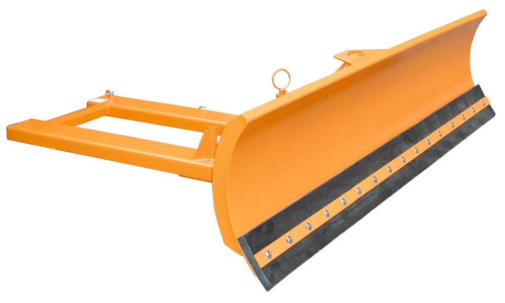 ∙ Robuste Stahlkonstruktion RAL 2000 gelborange lackiert · Gummischürfleiste ∙ Einfache Aufnahme mit Gabelzinken ∙ Sicherung gegen unbeabsichtigtes Abrutschen ∙ Räumschild 2-fach nach rechts und links verstellbar ∙ Schnelles Wechseln der Schürfleisten und Federklappschare möglich · Schildhöhe 620 mm