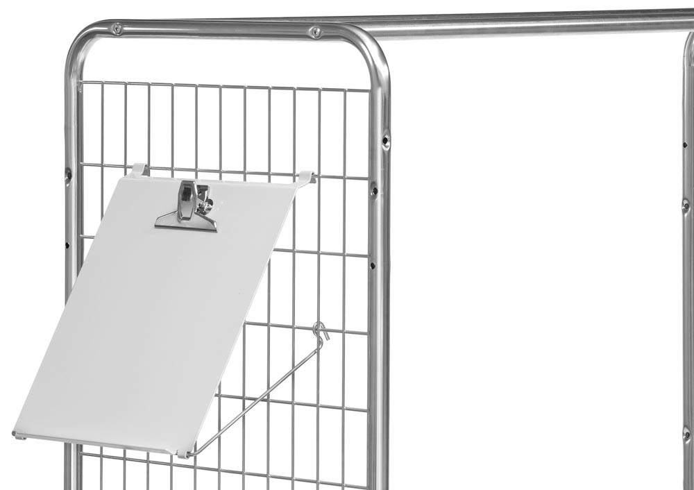 · Aus Stahlblech · Pulverbeschichtet in RAL 7035 lichtgrau · In Stirnwand einhängbar · Einstellbare Neigung mittels Stützbügel · Mit Papierklemme · Nutzfläche B x H 335 x 352 mm