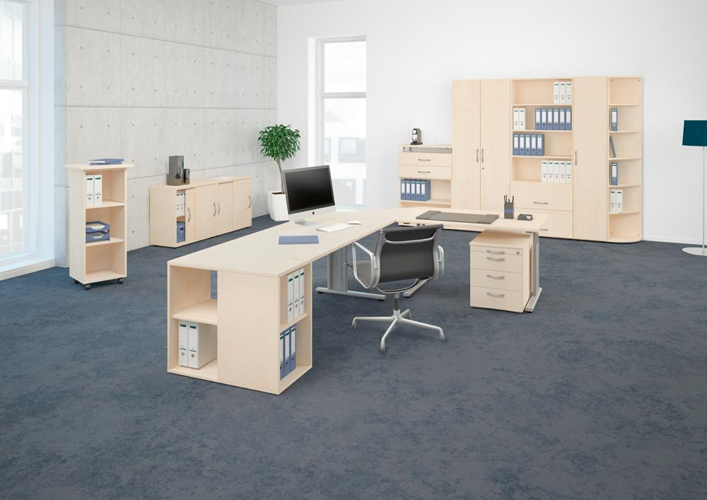 Schreibtisch, BxTxH 800x800x680-820 mm, höhenverstellbar, Platte ahorn, C-Fuß-Gestell silber E1406729