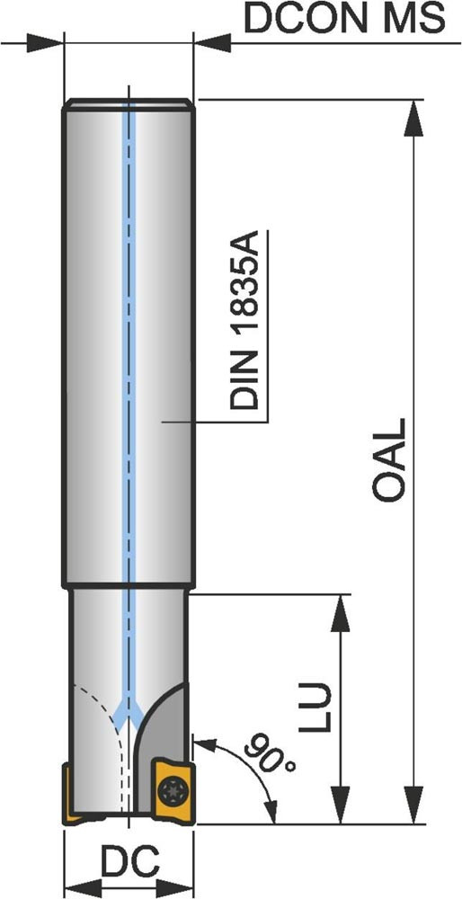 Eckfräser mit positiver/negativer Geometrie zum spannen von 5 Stück ADMX 0702.. oder ADEX 0702.. einseitigen Wendeschneidplatten · Schnittdurchmesser 25mm mit 90° Anstellwinkel und 25mm Zylinderschaft gemäß DIN 1835A · 24mm Funktionslänge 140mm Gesamtlänge · Kühlkanalbohrung und ungleiche Teilung zum flachen Schulterfräsen · flachen Nutfräsen · Rampen · Helikalen Fräsen · Tauchfräsen und progressiven Eintauchen mit einer maximalen Schnitttiefe von 5.0mm