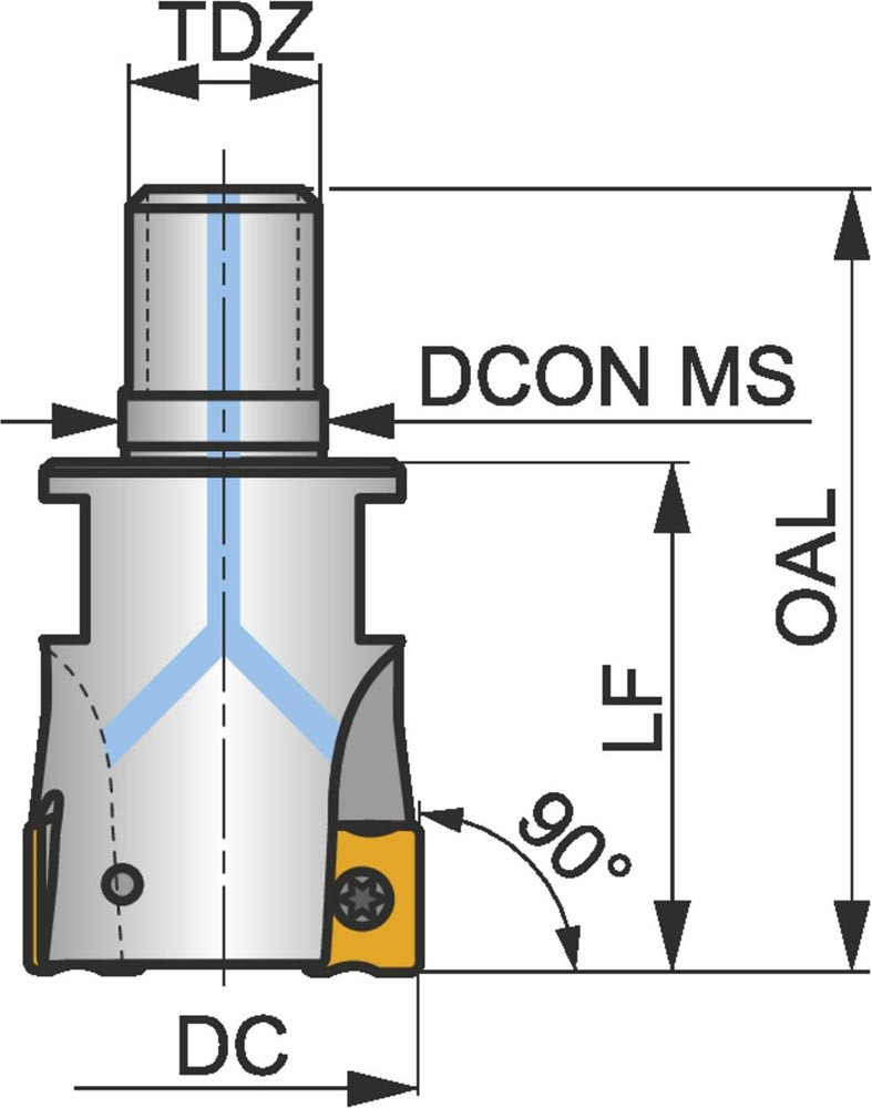 Eckfräser mit doppelt negativer Geometrie zum spannen von 3 Stück LNGX 1205.. oder LNGU 1205.. doppelseitigen Wendeschneidplatten · Schnittdurchmesser 32mm mit 90° Anstellwinkel und M16 Gewindeschaft für modulare Standardhalter · 43mm Überstandslänge · Kühlkanalbohrung zum flachen Schulterfräsen · flachen Nutfräsen und Tauchfräsen mit einer maximalen Schnitttiefe von 9.0mm
