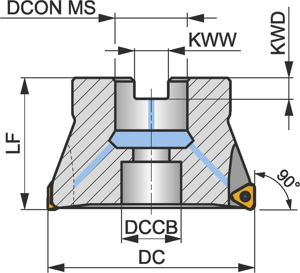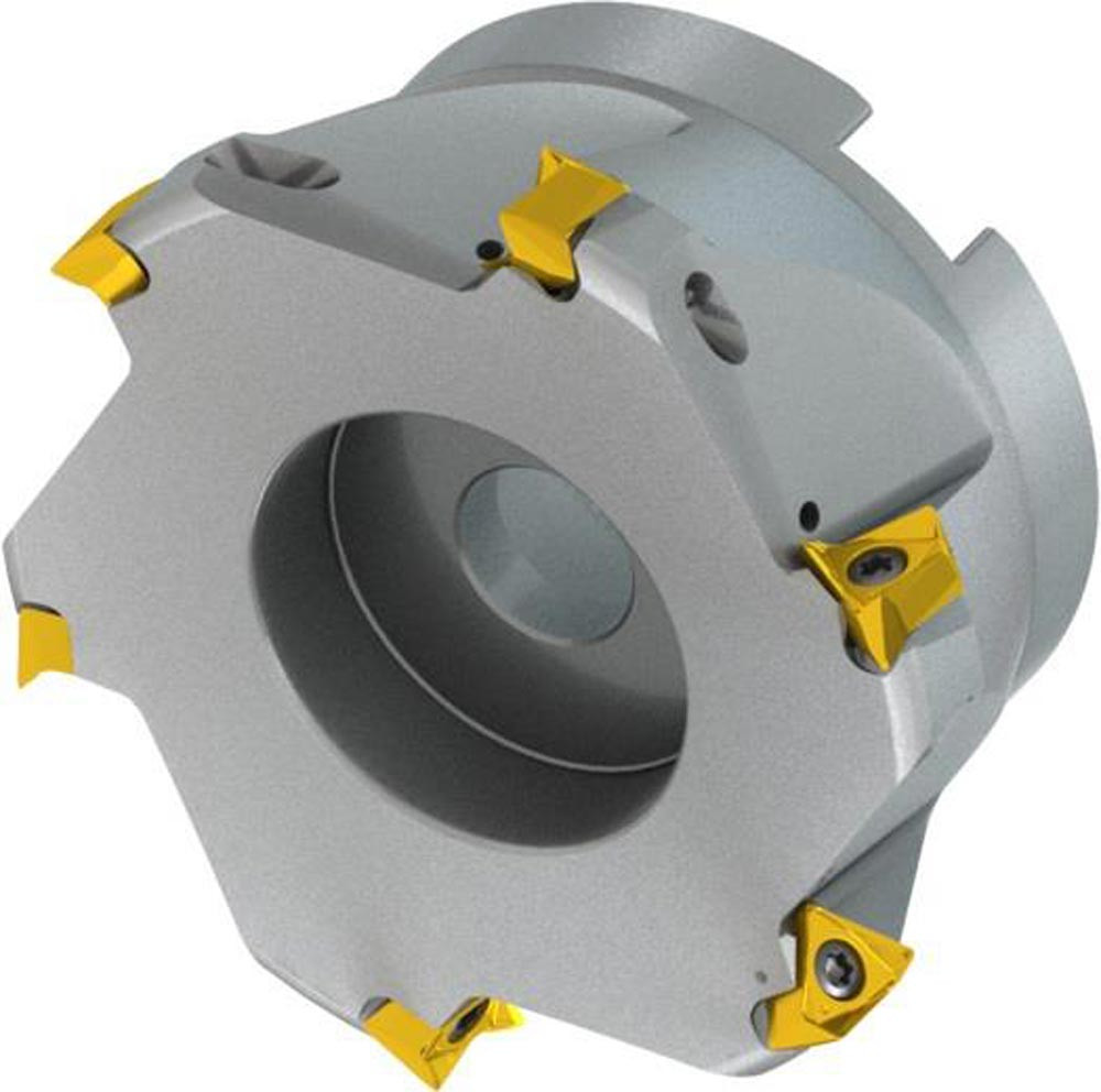 Eck-und Planfräser mit doppelt negativer Geometrie welche 4 aus TNGX 1606.. doppelseitige Wendeschneidplatte · Schneiddurchmesser 63mm mit 90° Anfahrwinkel und 22mm Bohrung gemäß DIN 8030-A · 40mm Einsatzlänge · durchgehende Kühlung und ungleicher Teilung zum Planfräsen · flachen Schulterfräsen · flachen Nutfräsen und Spiralfräsen in vorbearbeiteten Löchern