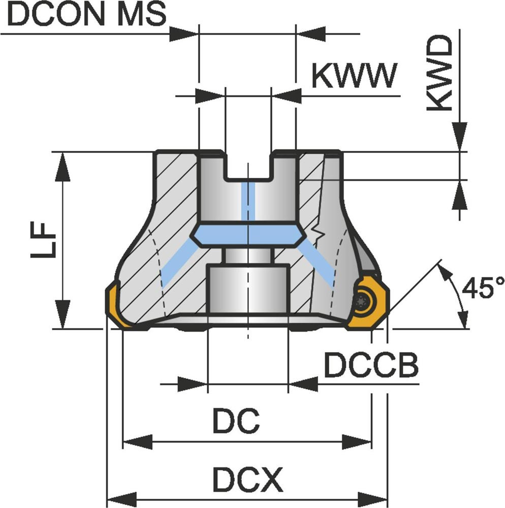 Kopier-Planfräser mit positiver/negativer Geometrie zum spannen von 5 Stück OD.T 05IM · RD.T 12IM oder SD.T 12IM einseitigen Wendeschneidplatten · Schnittdurchmesser 55.6mm mit 45 / 90° Anstellwinkel und 22mm Verbindungsbohrung gemäß DIN 8030-A · 40mm Überstandslänge · Kühlkanalbohrung und ungleiche Teilung zum Planfräsen · Kopierfräsen · flachen Schulterfräsen · flachen Nutfräsen · Rampen · Helikalen Fräsen · Tauchfräsen · progressiven Eintauchen und Entgratfräsen mit einer maximalen Schnitttiefe von 3.0 (6.0/10.0)mm