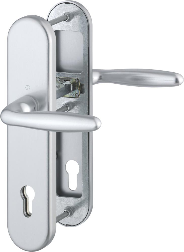 für Abschlusstüren · einbruchhemmend nach DIN 18257 · Stahl-Unterkonstruktion im Außen- und Innenschild · mit Rückholfeder-Paket · außen: gekröpfter, feststehender Kopf (ummontierbar) · innen: loser Türgriff, mit Schnellstift-Verbindung · hochfeste, verdeckte Verschraubung · Knopfschild-Randhöhe: 12 mm · DIN links / rechts · Widerstandsklasse ES 1