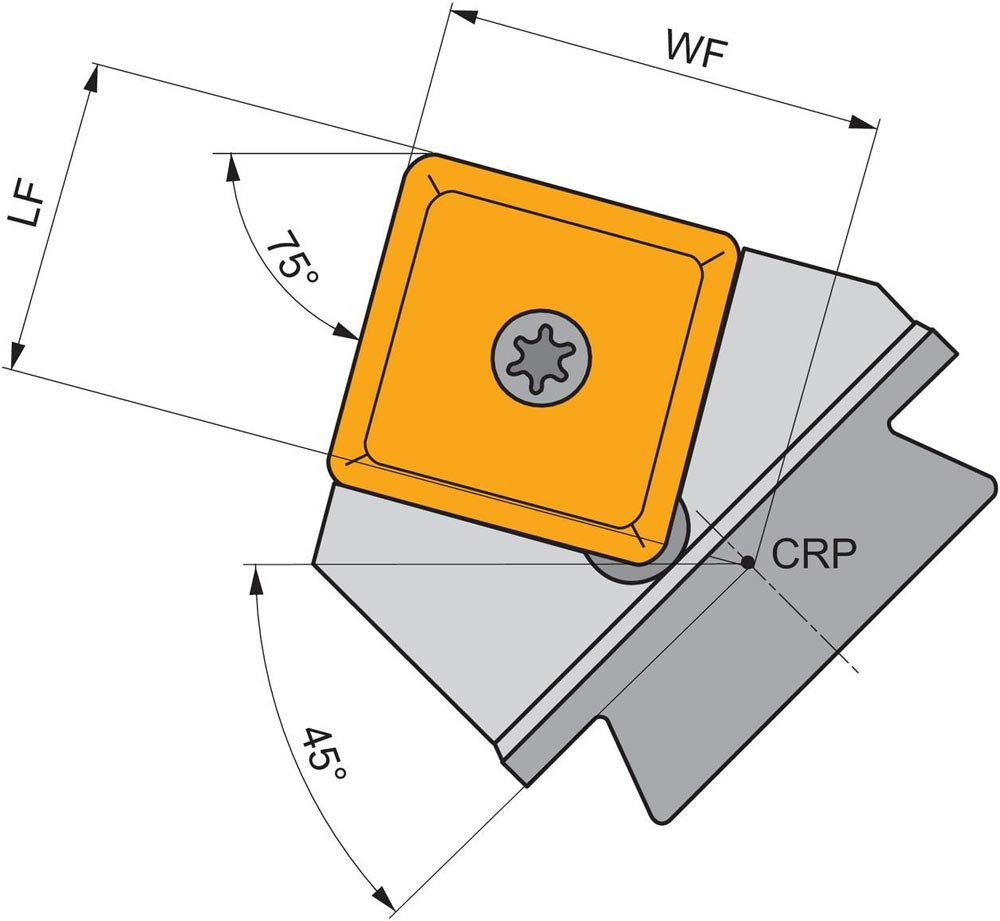 Modular Drehsystem mit Schraubklemmung zum spannen von Viereckig positive Wendeschneidplatten mit einem Innenkreisdurchmesser von 38.1mm · 9.52mm Dick (ISO Bezeichnung SC.. 3809.. ) · zur Montage mit DHKR .. für rechte Ausführung zum 75° Stirndrehen mit Zylinderschaft für Kegeldrehen · Stirndrehen ohne Schulter und Längsdrehen ohne Schulter