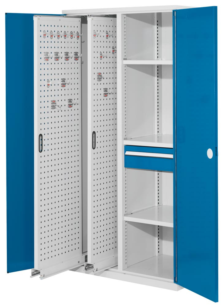 Schwerlastschrank, Sichtfenstertüren, 2 Vertikalauszüge, 3 Fachböden, 2 Schubl. BxTxH 1000x600x1950 mm, RAL 7035 E863645