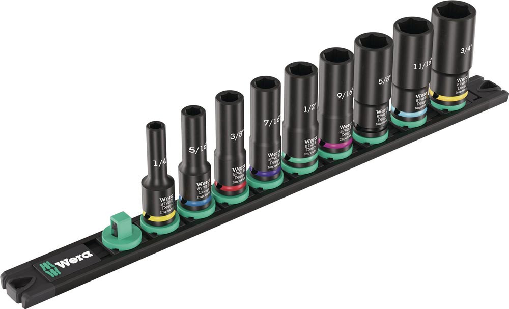 auf Magnetleiste zur temporären Befestigung z. B. an Wand, Regal, Werkstattwagen · leichtgängiger Drehmechanismus für sichere Aufbewahrung und einfache Entnahme des Werkzeuges · 3/8″-Antrieb · lange Ausführung für tiefliegende Verschraubungen und überstehende Gewindestangen · mit Sechskantprofil und Nut mit Bohrung · für den Einsatz mit elektrisch oder mit Druckluft angetriebenen Schlagschraubern mit 3/8″ Antrieb · Take it easy Werkzeugfinder: Farbkennzeichnung nach Größen - zum einfachen und schnellen Finden des benötigten Werkzeuges