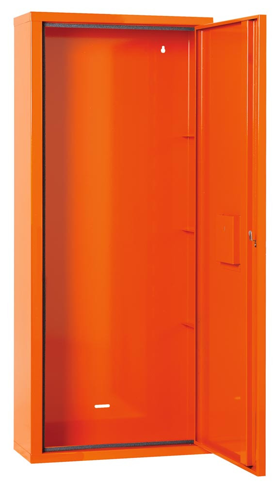 ∙ Aus Qualitäts-Feinblech ∙ Orange lackiert ∙ Eintürig ∙ Verschließbar ∙ Umlaufende Dichtung ∙ Notschlüsselfach mit Glasabdeckung ∙ Siebdruck und Farbpiktogramme ∙ Wahlweise gefüllt oder leer lieferbar