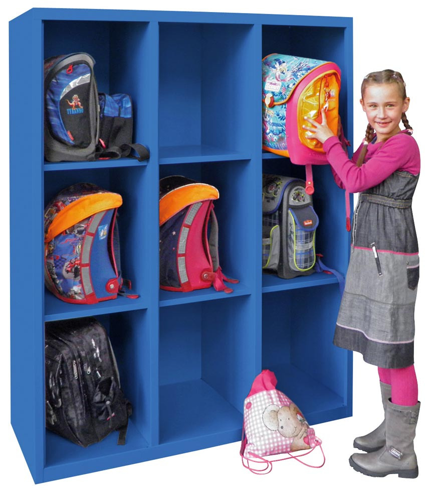 · Mit 50 mm hohem Sockel · Fest verschweißte Konstruktion · XXL-Fächer für alle handelsüblichen Schulranzen · Lichte Fachmaße B x T x H 360 x 470 x 470 mm