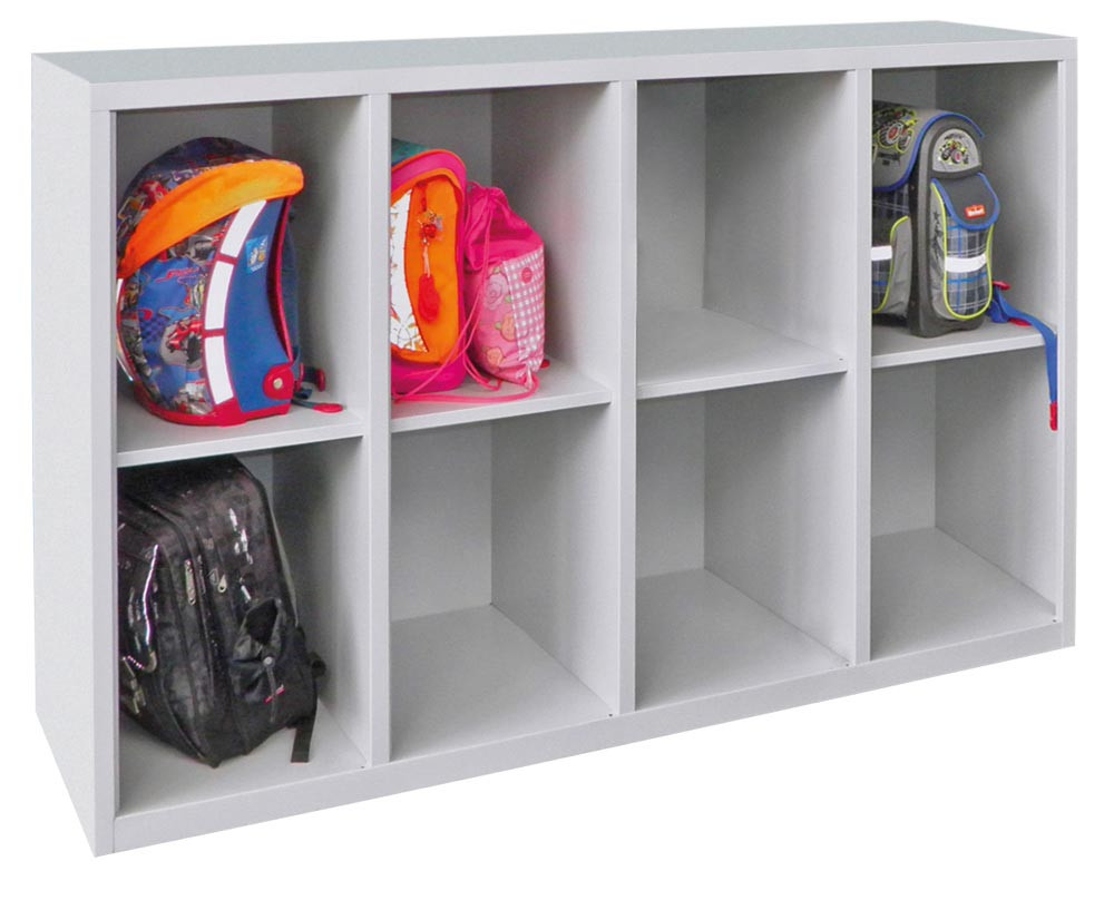 · Mit 50 mm hohem Sockel · Fest verschweißte Konstruktion · XXL-Fächer für alle handelsüblichen Schulranzen · Lichte Fachmaße B x T x H 360 x 470 x 470 mm
