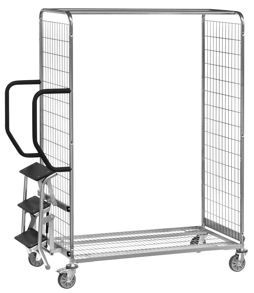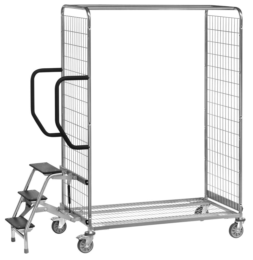 · Mit 3 Stufen aus rutschfesten Holzplatten · Oberste Stufe ca. 600 mm hoch, Greifhöhe 2800 mm · Bei Belastung stehen die Stufen fest auf dem Boden, wodurch der Wagen sicher blockiert wird · Rastsperre verhindert das Ankippen des Wagens · Mit Gasfeder für leichtes Anklappen der Stufen · Mit den Trittstufen werden weiter vorstehende Rohrschiebegriffe zum Festhalten und Anlehnen mitgeliefert, die Gesamtlänge des Wagens erhöht sich um 100 mm · Nicht mit Deichsel und Kupplung kombinierbar