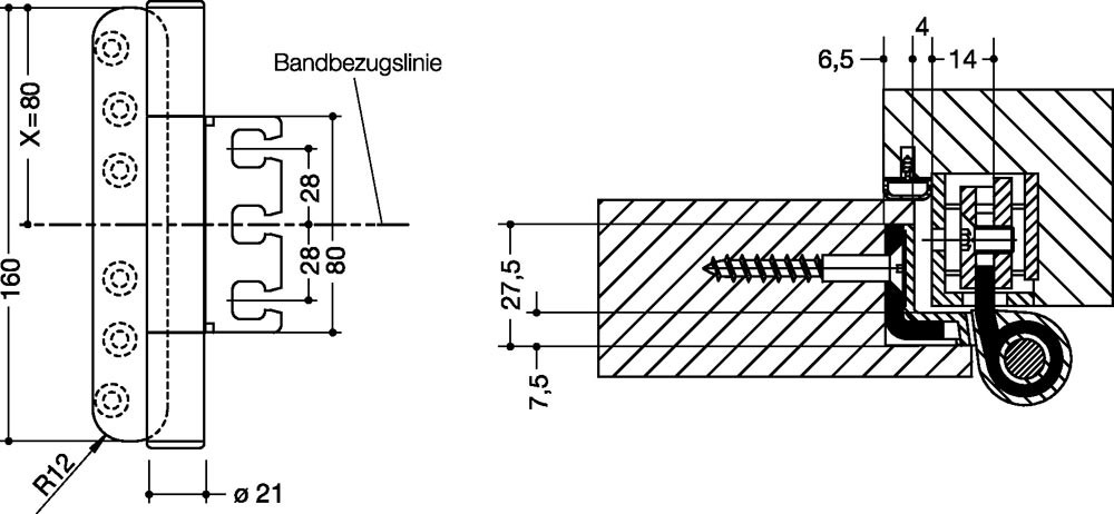 Dreirollenband für gefälzte Türen mit einem Gewicht bis zu 180 kg · aus mattem Polyamid mit tragenden Stahlgerüst · geschlossene Bandrolle · Bauhöhe 160 mm · Bandrollendurchmesser 21 mm · Edelstahlachse, DIN rechts und DIN links verwendbar · zur Montage an Holz-, Stahl- und Aluminiumtüren mit dreidimensional verstellbaren Aufnahmeelementen VX... und VZX... · Ausführungsvorschlag! Bitte alle Maße und baulichen Gegebenheiten im Auftragsfall prüfen!