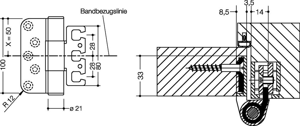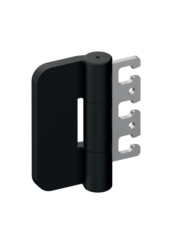 Dreirollenband für ungefälzte Türen mit einem Gewicht bis zu 100 kg, aus mattem Polyamid mit tragenden Stahlgerüst · geschlossene Bandrolle, Bauhöhe 100 mm · Bandrollendurchmesser 21 mm · Edelstahlachse · DIN rechts und DIN links verwendbar · zur Montage an Holz-, Stahl- und Aluminiumtüren mit dreidimensional verstellbaren Aufnahmeelementen VX... und VZX... · Ausführungsvorschlag! Bitte alle Maße und baulichen Gegebenheiten im Auftragsfall prüfen!