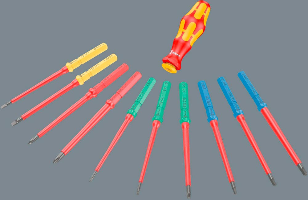 isolierter VDE Drehmomentschraubendreher-Satz · Sechskantaufnahme VDE Wechselklingen · überrutschende Drehmomentfunktion · nicht überziehbare Drehmomentfunktion · umschaltbare Schraubrichtung · wählbare Anzugsdrehmomente