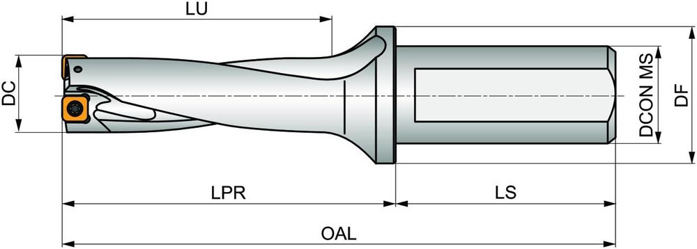 Wendeschneidplattenbohrer zum einsetzen von einer XPET 11T3.. Wendeschneidplatten als Zentrumschneide und einer SCET 09T3.. Wendeschneidplatte als Außenschneide · Bohrdurchmesser 1.250'' · mit einem 1.500'' abgeflachten Zylinderschaft nach ISO 9766 und Innenkühlung für maximale Bohrtiefen bis 3 x D