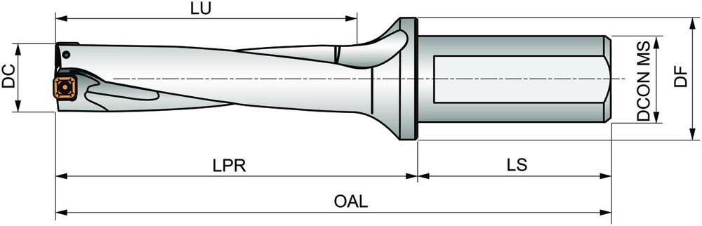 Wendeschneidplattenbohrer zum einsetzen von einer XPET 1904.. Wendeschneidplatten als Zentrumschneide und einer SCET 1505.. Wendeschneidplatte als Außenschneide · Bohrdurchmesser 58mm · mit einem 40mm abgeflachten Zylinderschaft nach ISO 9766 und Innenkühlung für maximale Bohrtiefen bis 4 x D