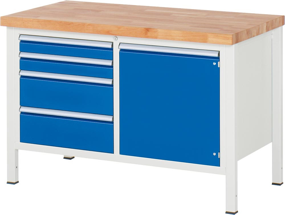 Werkbank, BxTxH 1250x900x840-1040 mm, Platte Buche 40 mm, 4 Schubladen: 2x120/2x150 mm, 1 Tür 540 mm, 1 Fachboden, RAL 7035/5010 E6490746