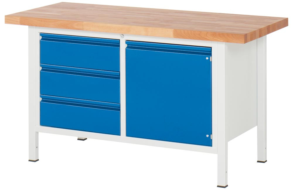 Werkbank, BxTxH 1250x700x840 mm, Platte Buche 40 mm, 3 Schubladen 180 mm, 1 Türen 540 mm, 1 Fachboden, RAL 7035/5010 E1978806