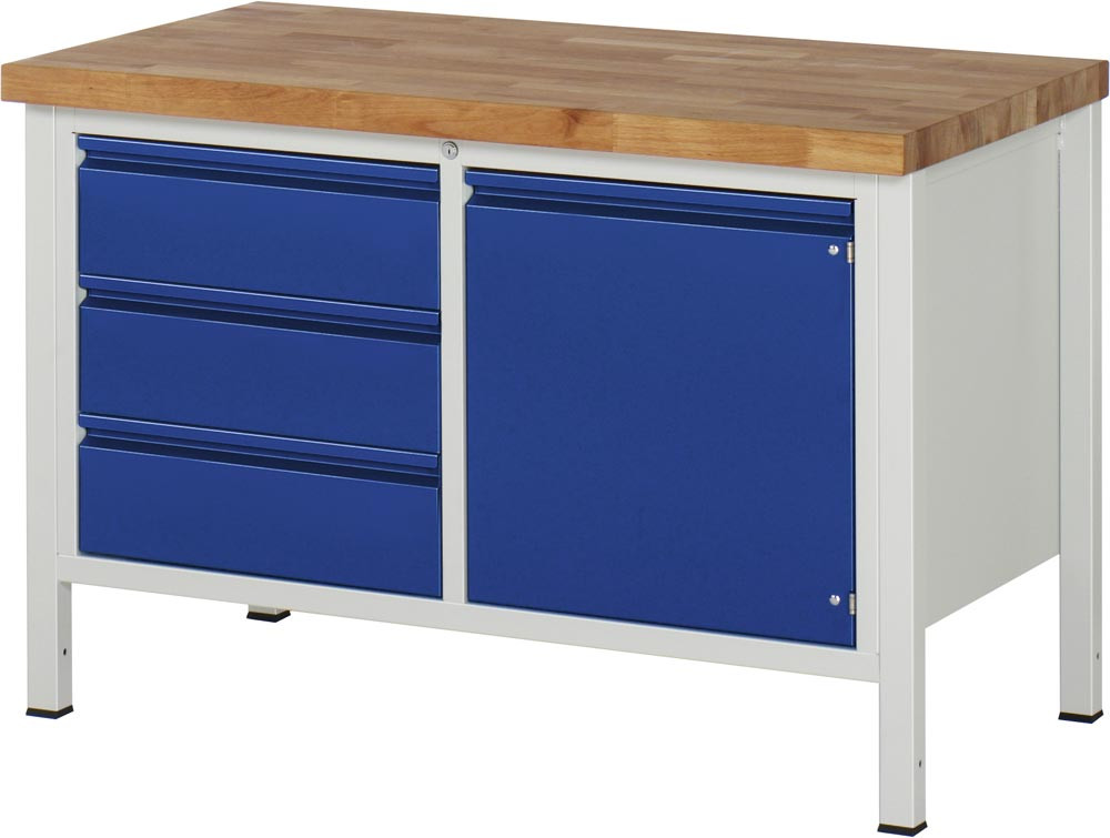 Werkbank, BxTxH 1250x700x840 mm, Platte Buche 40 mm, 3 Schubladen 180 mm, 1 Türen 540 mm, 1 Fachboden, RAL 7035/5010 E1978806