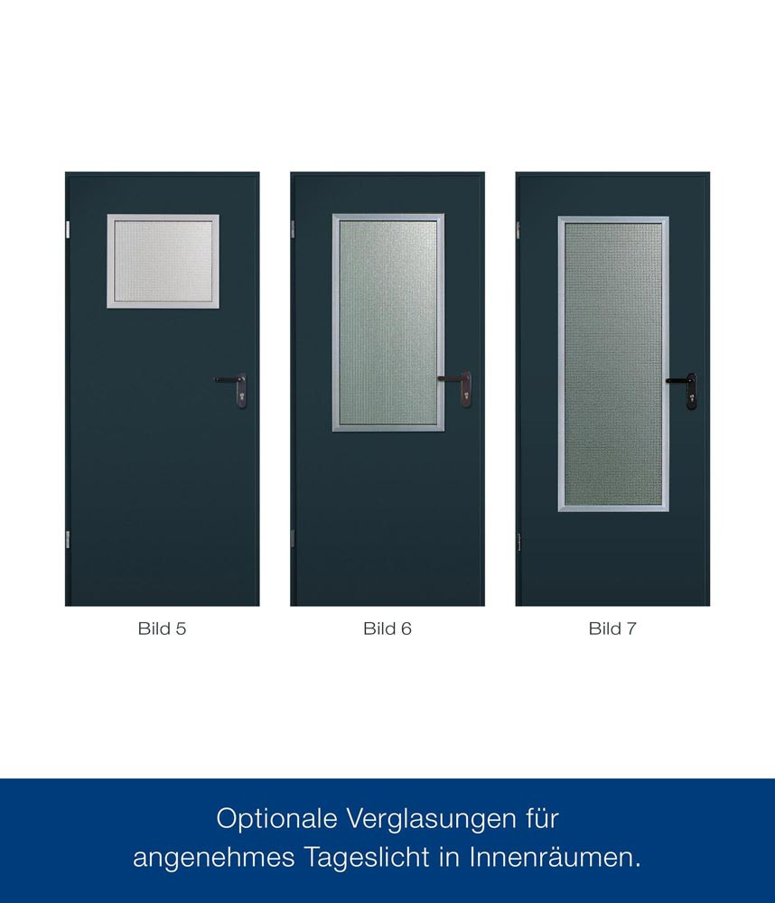 Türblatt 3-seitig gefälzt (Dickfalz), 40 mm dick · Blechdicke 0,8 mm · mit Styroporeinlage · Einsteckschloss mit Stahlfalle · vorgerichtet für Kurzschild · U-Profil im unteren Bereich · mit Bändern der Serie V0026 WF, verzinkt · 1 x Sicherungsbolzen (799 mm ab Türkasten) · Eckzarge B1 · mit Bändern V1000-01 WF, verzinkt · ohne Bodeneinstand · mit Durchschraubmontage durch den Nutgrund (inklusive Dübelanker) · inklusive Dichtung · Drückergarnitur Kunststoff schwarz · Element verpackt in Schrumpffolie