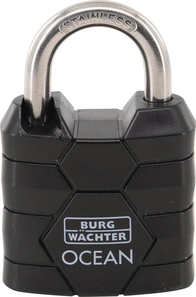 massiver Messingkörper · stoß- und kratzfester Kunststoffmantel · Bügel doppelt verriegelt · Edelstahl rostfrei · seewasserfest